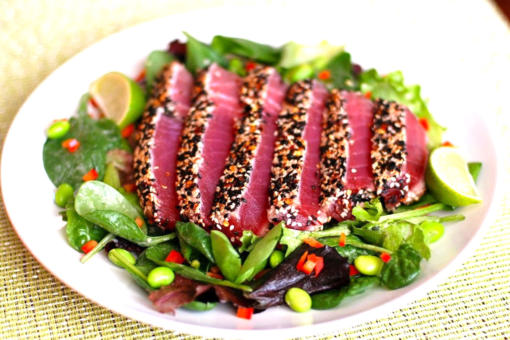 pieces of marinated or seared Fish (NOT necessarily Ahi Tuna) doused in seasonings.