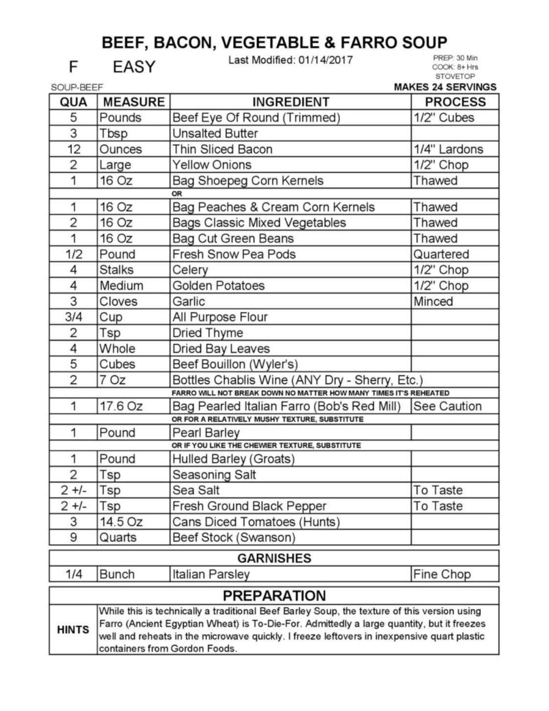 BEEF, BACON, VEGETABLE & FARO SOUP