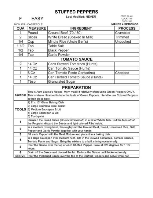 This is Aunt Louise's Recipe. Mom made it relatively often using Green Peppers ONLY. This