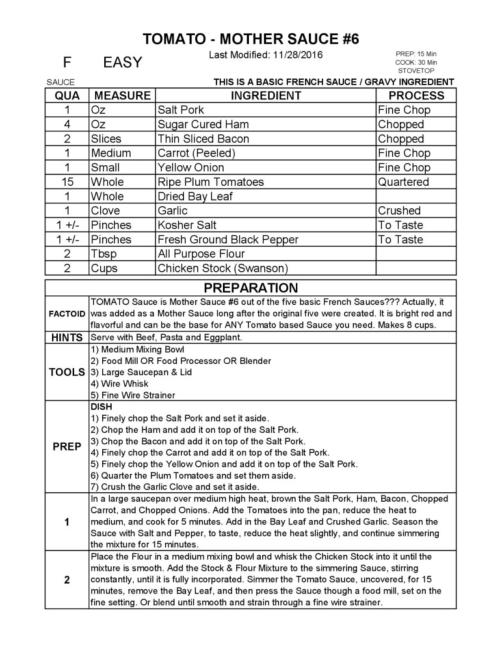 FRENCH MOTHER SAUCE #6 - TOMATO SAUCE